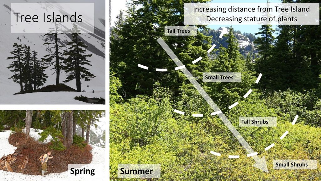 Tree islands (clusters of trees found throughout subalpine meadows) are very important as early season nesting and foraging sites for bumble bee when all other areas are covered with deep snow.